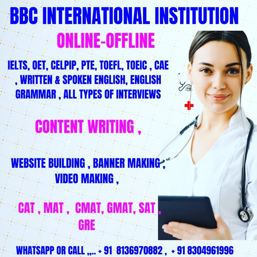 .BBC INTERNATIONAL INSTITUTION – ONLINE-OFFLINE … IELTS , OET , PTE , CELPIP , TOEFL , CELBAN , CAEL , UKVI IELTS , DUOLINGO , TOEIC …. Spoken English… Web Designing … Coaching or Training…. Maths Tuition…. English Grammar Tuition…